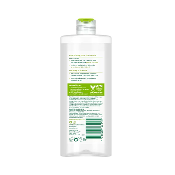 این محصول، پاککنندهی آرایش کلاسیک و برندهی جوایز متعدد از برند سیمپل است که به دلیل فرمولاسیون فوقالعاده ملایم و در عین حال مؤثر خود، شهرت جهانی دارد. راز این محصول در استفاده از آب سهبار تصفیهشده نهفته است؛ خالصترین نوع آب که هرگونه ناخالصی که ممکن است باعث تحریک پوست شود، از آن حذف شده. این آب به همراه حبابهای پاککنندهی میسلار, به آرامی و بدون نیاز به سایش، آرایش و آلودگیها را از روی پوست پاک کرده و با ترکیبی از ویتامینهای B3 و C, به افزایش ۹۰ درصدی رطوبت پوست کمک میکند.