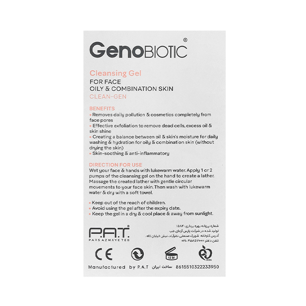 ژل شستشوی صورت ژنوبایوتیک کنترلکننده چربی مناسب پوستهای چرب و مختلط مدل Clean-Gen حجم 200 میل