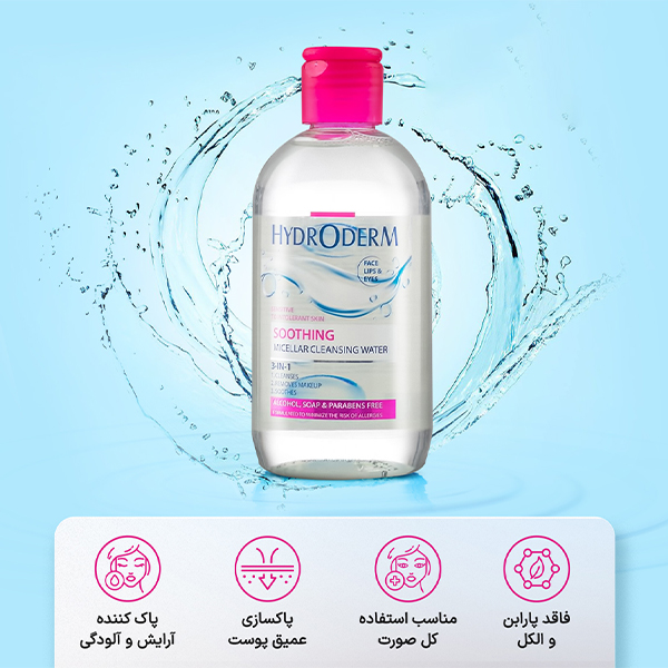میسلار واتر ۳ در ۱ التیام بخش هیدرودرم مدل Soothing, یک محلول پاک کننده با تکنولوژی میسل است که به طور اختصاصی برای پوستهای حساس و تحریک پذیر فرموله شده است. این محصول با قابلیت پاکسازی مواد آرایشی، گرد و غبار و آلودگیها از سطح پوست، چشم و لب، فرآیند روتین شبانه رو در یک مرحله ساده میکنه و بدون نیاز به آبکشی است. این فرمولاسیون فاقد ترکیبات تحریک کننده بوده و فاقد الکل، صابون و پارابن است. ترکیبات اصلی آن شامل هیالورونیک اسید هیدرولیز شده، عصاره میوه خیار و ژل برگ آلوئه ورا هستن که خواص آبرسانی عمیق، ضد التهابی و التیامبخشی قوی به پوست میدن و به کاهش قرمزی و التهاب پوستهای حساس کمک میکنن.