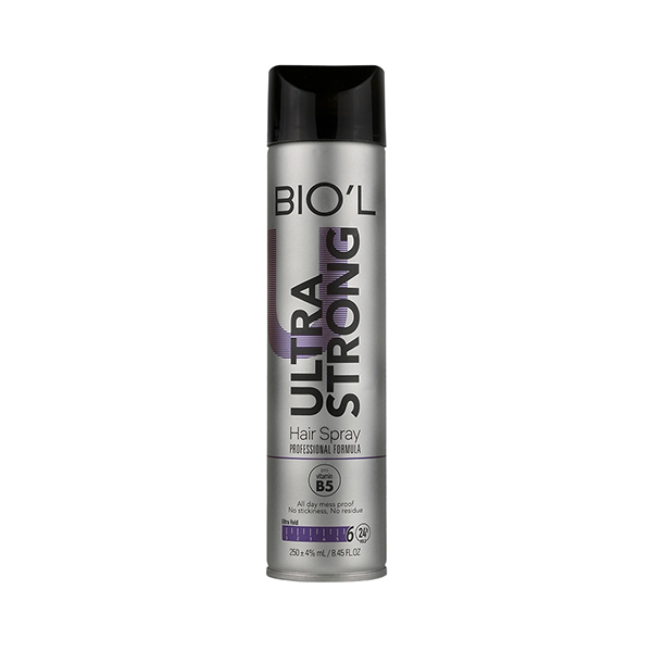 اسپری حالت دهنده مو بیول (Biol) مدل Ultra Strong, یک اسپری فیکس کننده با قدرت نگهدارندگی بسیار قوی (سطح ۵ یا ۶) است که برای انواع مو طراحی شده. این اسپری موها رو برای مدت طولانی بدون تغییر در حالت دلخواه شما ثابت نگه می‌داره. فرمولاسیون این ژل حاوی کراتین هیدرولیز شده و پروویتامین B5 (پانتنول) است که به تقویت، ترمیم و احیای موهای آسیب‌دیده کمک می‌کنن. این محصول دارای فیلتر محافظت در برابر اشعه ماورای بنفش (UV Filter) است که از ساختار مو در برابر آفتاب و آلودگی‌های محیطی محافظت می‌کنه. Ultra Strong با خشک شدن سریع و مقاومت بالا در برابر رطوبتبدون ایجاد سفیدی و شوره روی مو، به درخشندگی و افزایش خاصیت ارتجاعی موها کمک می‌نماید.