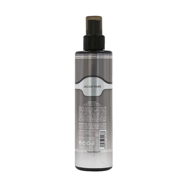 بادی اسپلش مردانه ژک ساف (Jacsaf) مدل Dark Musk (مشک تیره), یک خوشبو کننده آبرسان با حجم ۲۰۰ میلیلیتر است که برای آقایان طراحی شده. این بادی اسپلش با رایحهای گرم، تلخ و چوبی و گروه بویایی شرقی-چوبی (مشابه عطر معروف ابرکرومبی اند فیچ فیبرس - Abercrombie & Fitch Fierce) است. این بادی اسپلش به طور مؤثر بوی نامطبوع تعریق رو کنترل کرده و فاقد ترکیبات مضر است. نتهای بویایی آن شامل اسطوخودوس در نت آغازی، مشک و عنبر در نت میانی و روایح چوبی و ادویه در نت پایانی است. این بادی اسپلش با آبرسانی به پوست، از خشکی جلوگیری کرده و با ماندگاری بالا و پخش بوی قوی, برای استفاده روزانه، بهویژه در فصول سرد سال (پاییز و زمستان), ایدهآل است.