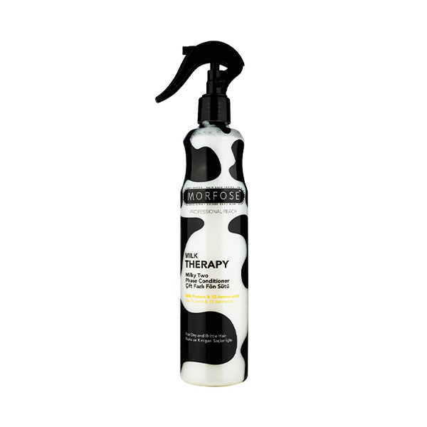 اسپری دوفاز مو مورفوس (Morfose) مدل Milk Therapy (شیر درمانی), یک نرم کننده بدون نیاز به آبکشی (Leave-in) است که برای انواع مو، به ویژه موهای خشک و آسیب دیده طراحی شده. این محصول بافت دوفاز شیری داره و به سرعت جذب موها میشه. فرمولاسیون این لوسیون حاوی ترکیبات مغذی و ترمیمکننده ساختاری شامل پروتئین شیر و ۱۲ نوع آمینو اسید است. پروتئین شیر به تنظیم تعادل رطوبت مو کمک کرده و موها رو نرم و براق میسازه. ۱۲ آمینو اسید به عنوان واحدهای سازنده، به ترمیم سطوح آسیب دیده مو کمک کرده و استحکام موها رو افزایش میدن. این اسپری موها رو در برابر آسیبهای محیطی و شوک حرارتی سشوار و اتو محافظت میکنه و شانه پذیری رو آسان میسازه.