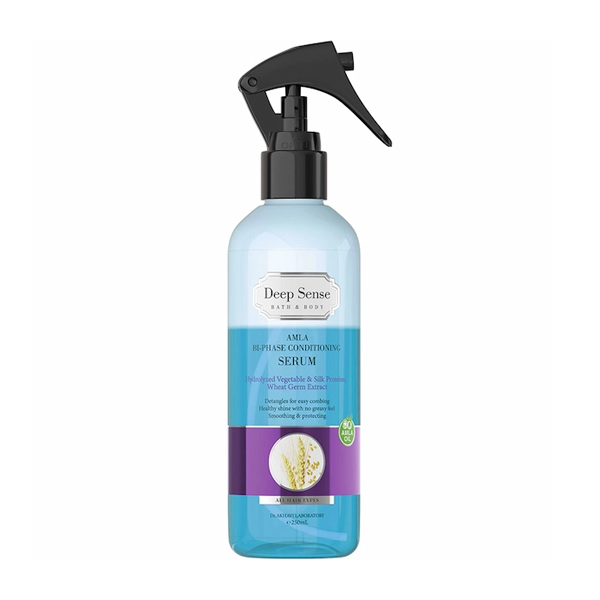 سرم دوفاز نرم کننده و باز کننده گره مو از برند دیپ سنس (Deep Sense)، یک محصول مراقبت موی بدون نیاز به آبکشی است که برای تأمین رطوبت، نرمی و محافظت حرارتی انواع مو طراحی شده است. این سرم دارای دو فاز مجزا است: فاز مایع که وظیفه آبرسانی و تأمین رطوبت را بر عهده دارد و فاز شیری که با مواد مغذی و روغنی، ساقه مو را پوشش می‌دهد. فرمولاسیون آن حاوی ترکیبات فعالی مانند روغن آملا (Amla) و پروتئین ابریشم هیدرولیز شده است. روغن آملا موها را تقویت کرده و پروتئین ابریشم به ترمیم ساختار تار مو و افزایش درخشش آن کمک می‌کند. این سرم همچنین دارای خواص محافظت در برابر حرارت است.
