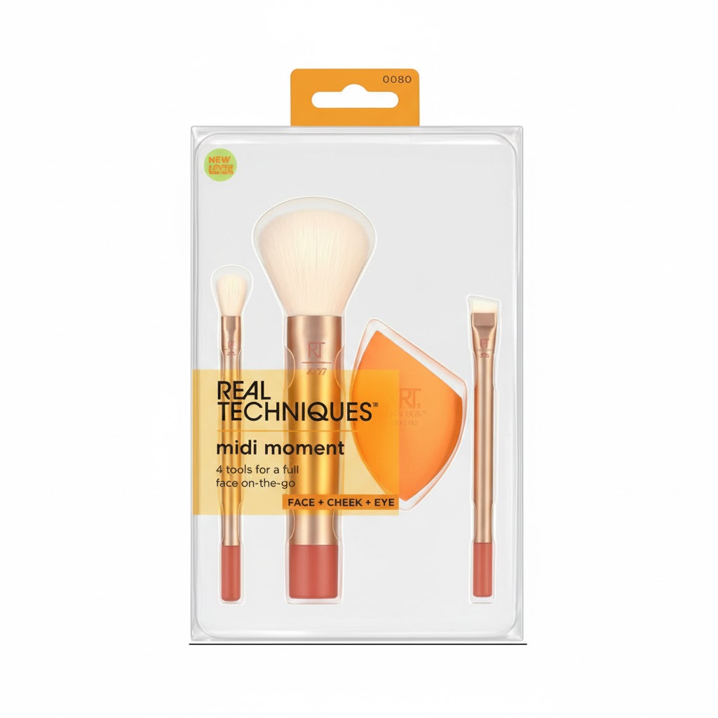 ست آرایشی ۴ عددی مدل Midi Moment از برند ریل تکنیک (Real Techniques)، یک مجموعه هوشمندانه شامل ۳ عدد براش با دسته‌های سایز متوسط (Midi) و ۱ عدد اسفنج آرایشی میرکل است. این نسخه خاص با تمرکز بر کاربردهای چندگانه، شامل براش همه‌کاره ۴۰۷، براش زاویه‌دار ۳۵۶ و براش سایه ۳۵۹ می‌باشد. دسته‌های مِیدی (Midi) به گونه‌ای طراحی شده‌اند که قد کوتاه‌تری نسبت به براش‌های معمولی دارند تا به راحتی در کیف آرایش جا شوند، اما سر براش‌ها با سایز اصلی و الیاف UltraPlush ساخته شده‌اند تا کیفیت آرایش شما فدای ابعاد ابزار نشود. این ست ۱۰۰٪ وگان و فاقد تست حیوانی است.