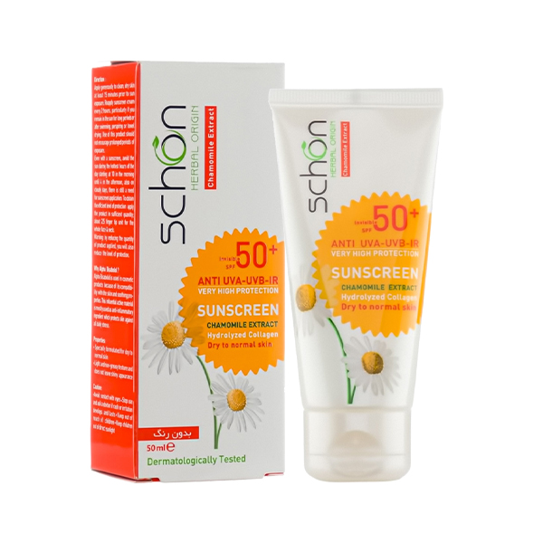 • کرم ضد آفتاب بی‌رنگ - برند شون (Schon) - مناسب پوست خشک و نرمال - حاوی عصاره بابونه - حجم ۵۰ میل